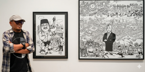 Putra Gara, misalnya, dikenal lewat gaya kartun yang kuat pada karakter figuratif dengan pesan sosial yang lugas. Dalam JAKARTUN 2026, ia menghadirkan karya bertajuk “Fahira Idris Jakarta Total One”, yang memotret relasi antara pemimpin dan dinamika kota. Karya ini memperlihatkan bagaimana kartun mampu menjadi medium refleksi yang ringan namun mengandung kritik.
